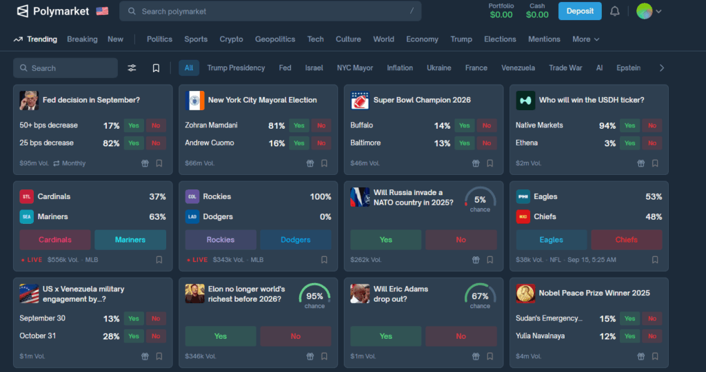 폴리마켓은 2020년 미국 뉴욕에서 설립된 블록체인 기반 예측 시장 플랫폼으로, 사용자가 다양한 사건의 결과에 대해 USDC 스테이블코인을 사용해 거래할 수 있는 곳입니다. 주제는 정치·경제·스포츠·대중문화까지 매우 다양합니다. 예를 들어 “테슬라가 2025년에 로보택시를 출시할까?”라는 질문이 시장으로 만들어지고, 참여자들은 사건이 일어날 것이라고 예상하면 ‘예’ 주식을, 아니라고 예상하면 ‘아니오’ 주식을 구매합니다. 각 주식은 1 USDC로 담보되며, 결과가 확정되면 최종 정산이 이루어집니다. 이렇게 형성된 가격은 단순한 베팅의 결과가 아니라 전 세계 참여자들의 집단적 판단이 모여 만들어진 확률 값입니다.